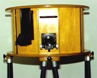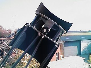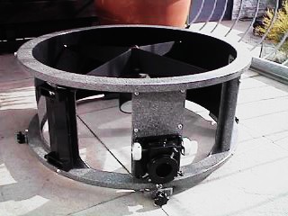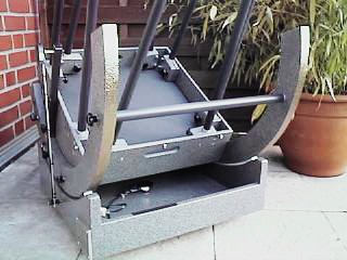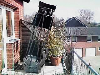 Anlässlich der Präsentation des 24" Ultraleicht Dobsons von Stathis Kafalis auf dem ITV 2001, beschloss ich meinem 88 Kilo schweren 18-Zoll Gitterrohr Dobson eine Schlankheitskur zu verpassen. Nach einem halben Jahr Bauzeit hatte ich im Januar 2002 ein Gerät von nur noch 54,5 Kilo vor mir, das in Stabilität und Leistung dem alten in nichts nachsteht, den Rücken beim Schleppen jedoch um einiges entlastet. Der Umbau kam praktisch einem Neubau gleich, lediglich die Spiegel (Pegasus Optics), der Okularauszug, der Telrad und die digitalen Teilkreise wurden übernommen. | ![]() |